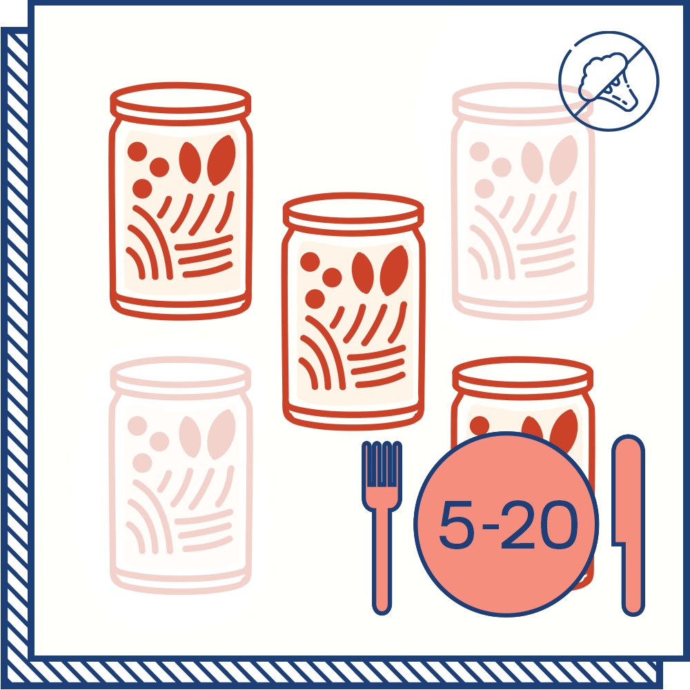 - All the jarred ingredients* to make recipes 1-3, 1-4, or 1-5 from our weekly Menu Calendar with 1, 2 or 4 portions per recipe.