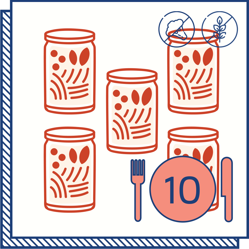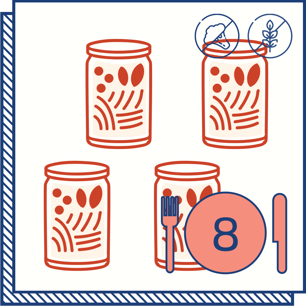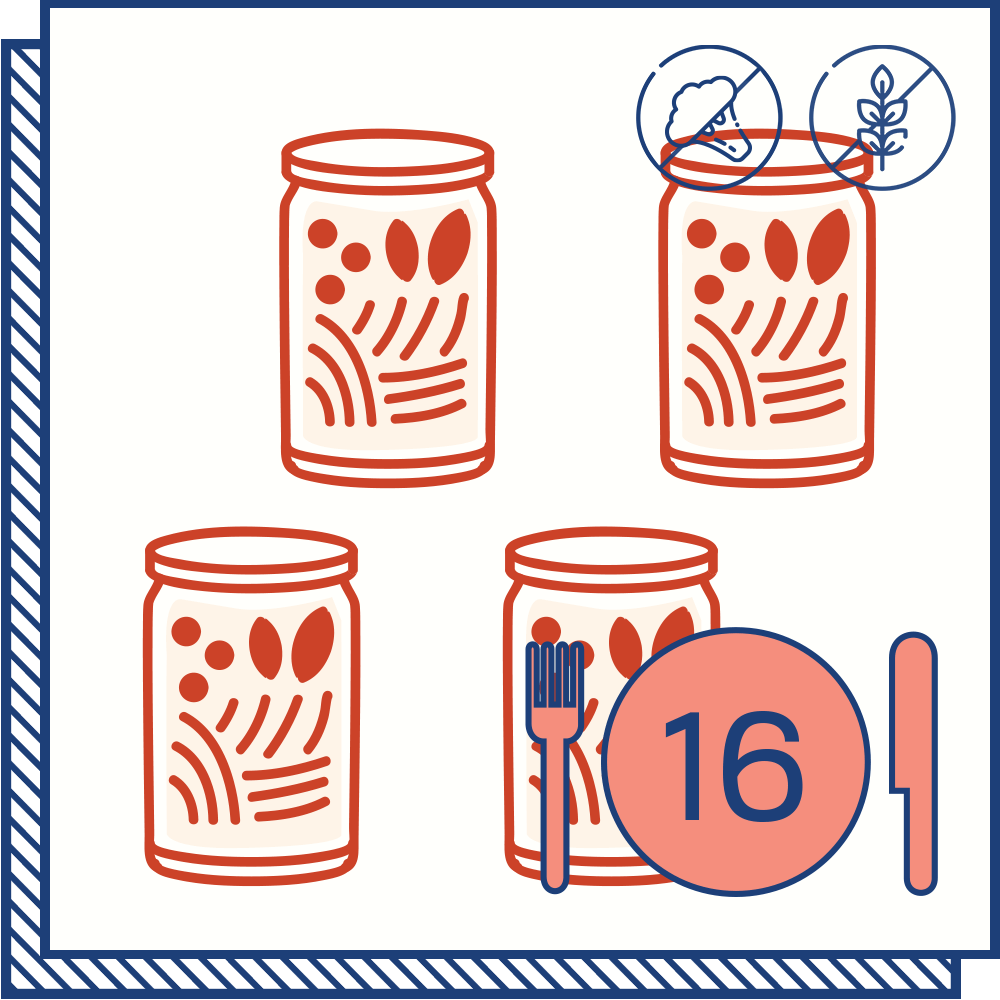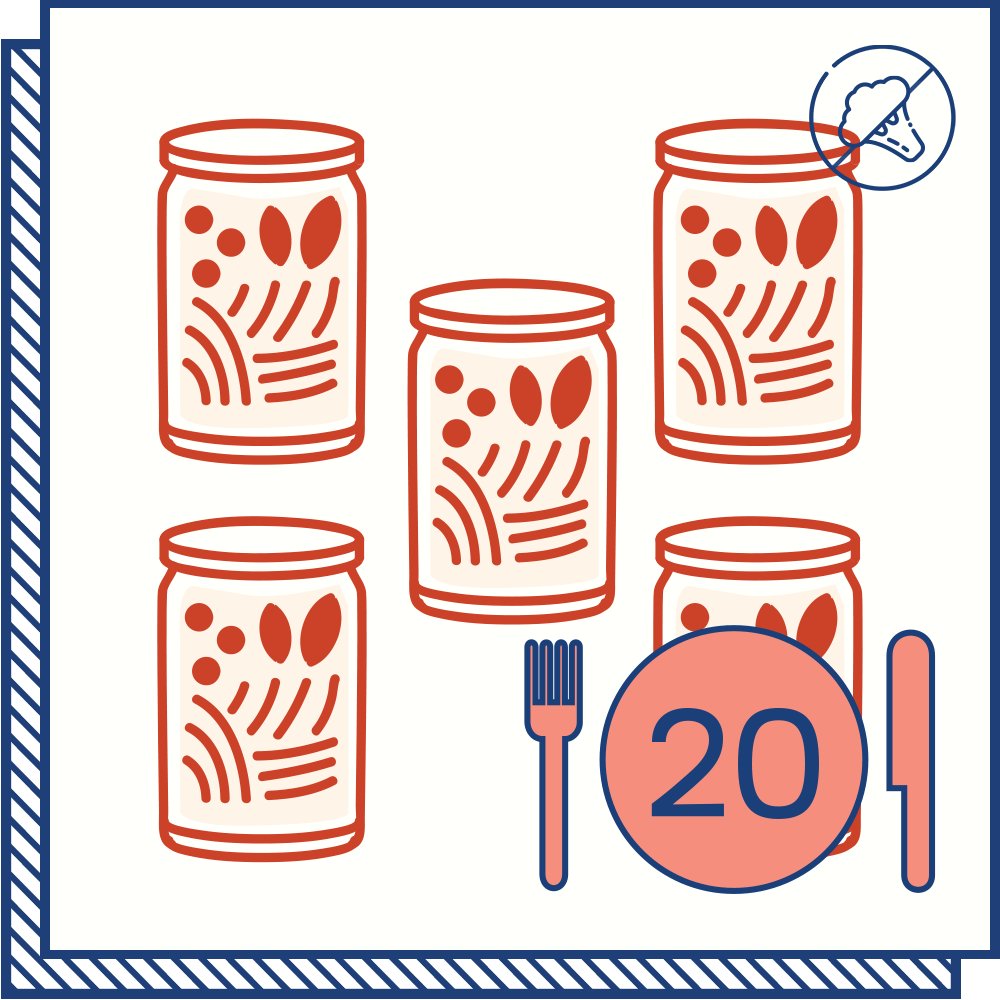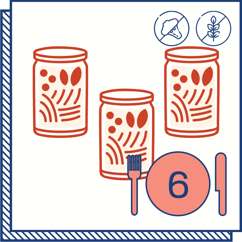 - All the jarred ingredients* to make recipes 1-3, 1-4, or 1-5 from our weekly Menu Calendar with 1, 2 or 4 portions per recipe.