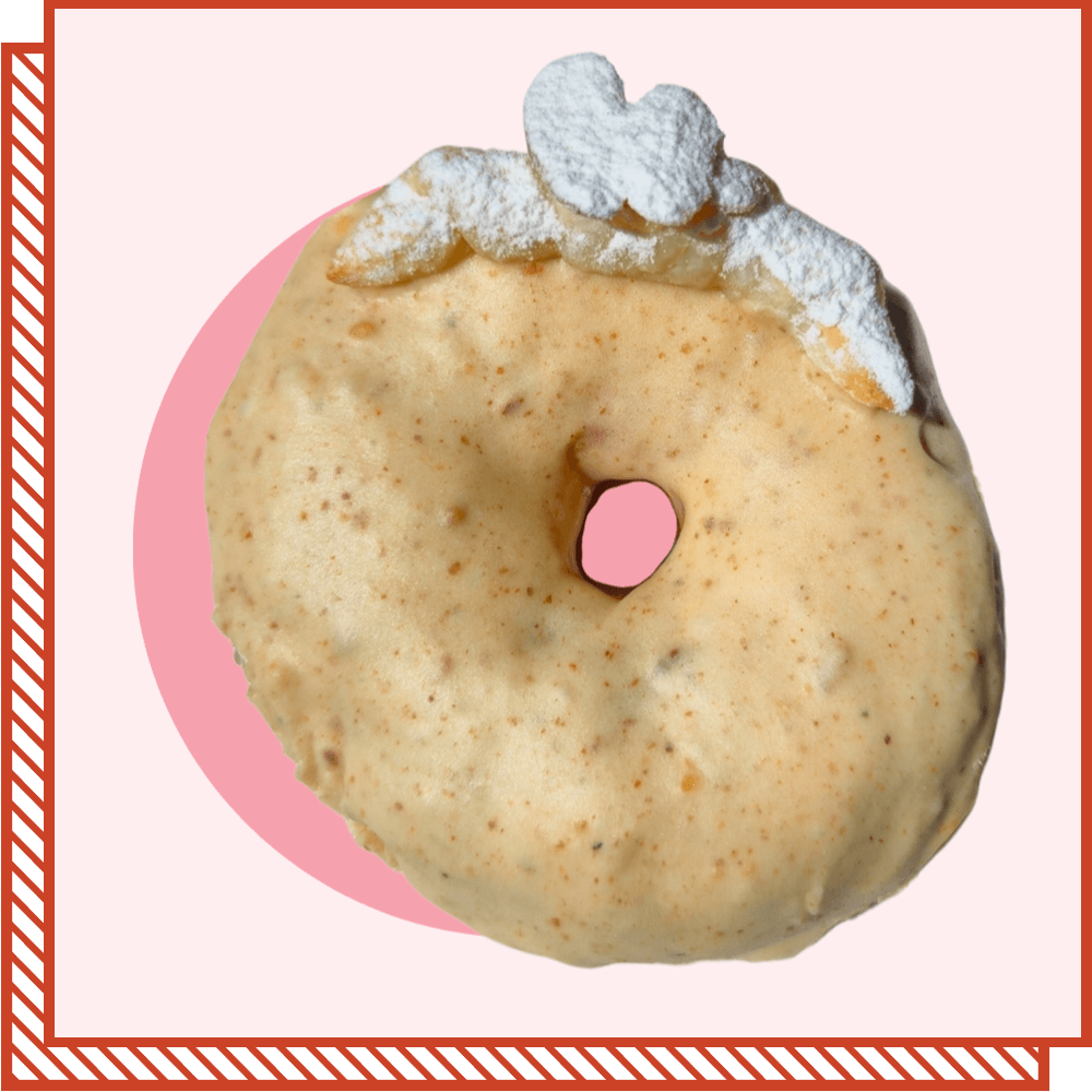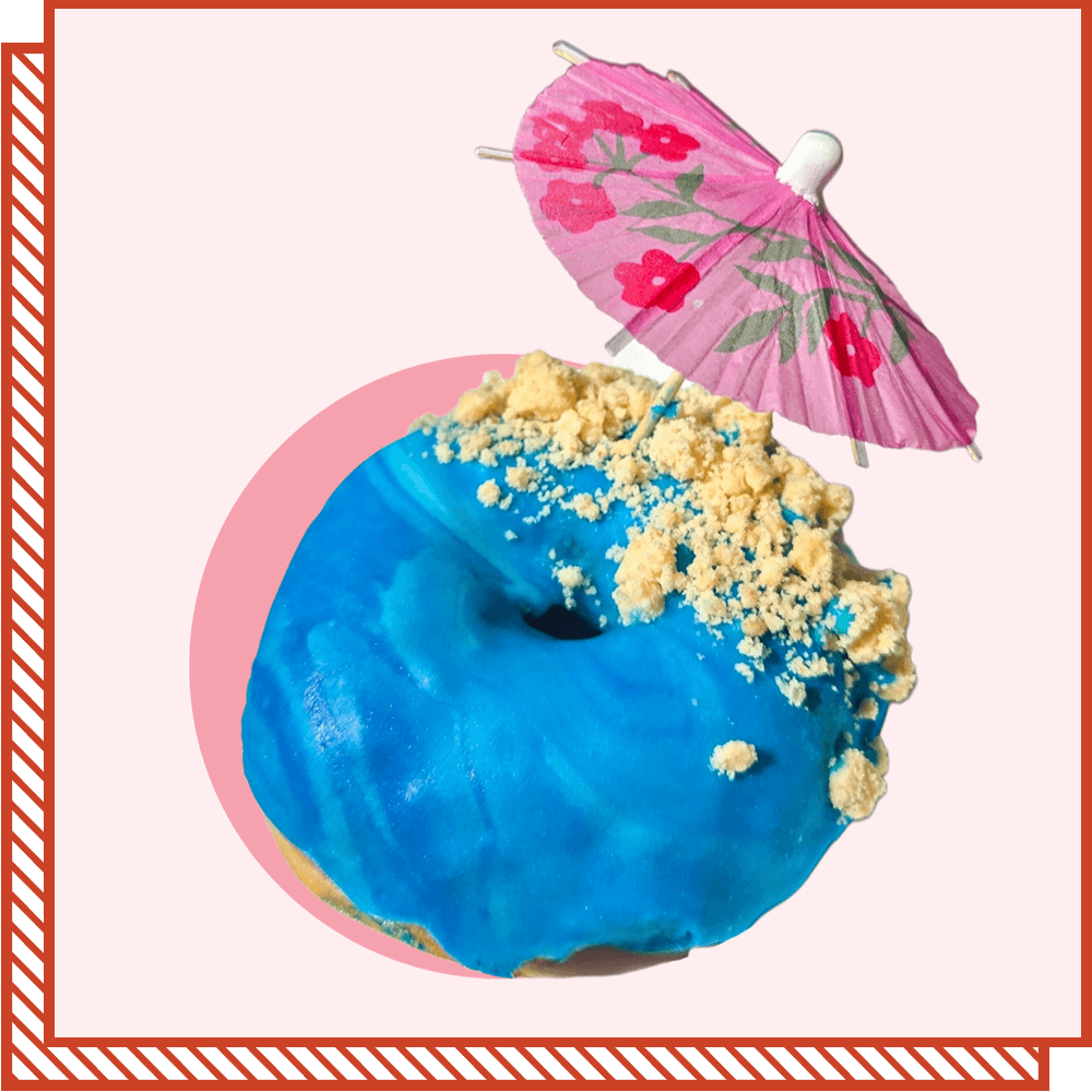 A ring donut dipped in a creamy vanilla glaze, topped with soft baked vanilla crumbles and decorated with a little sun umbrella (not edible!).