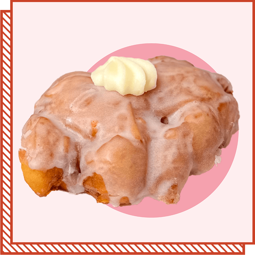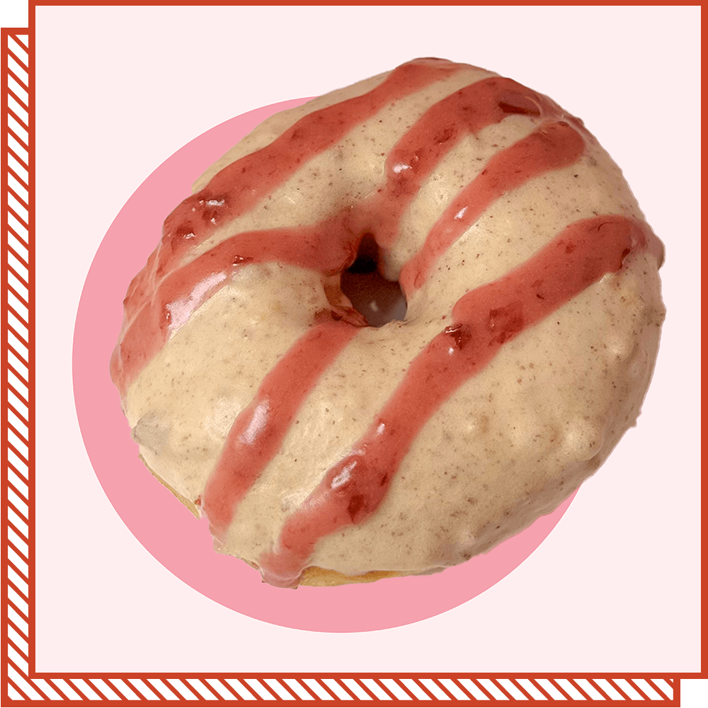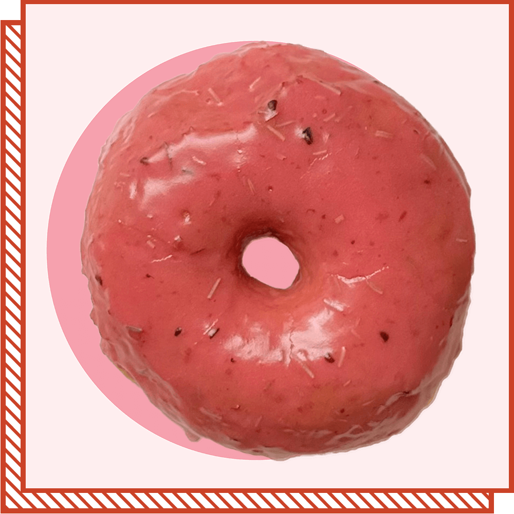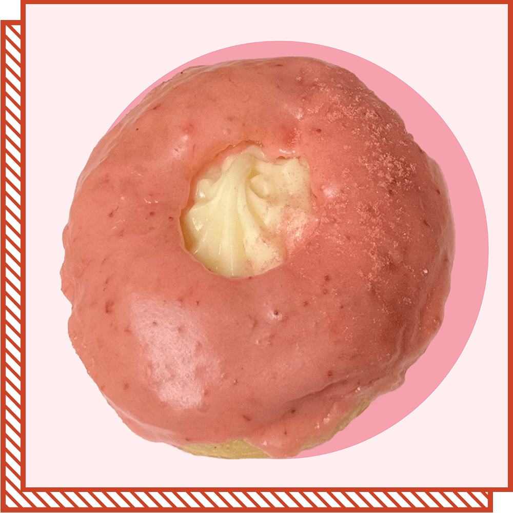 Strawberry Cheesecake $8.5 A donut dipped in a 100% strawberry fruit glaze, filled with a silky cream cheese frosting and topped with some magical pink sugar glitter.