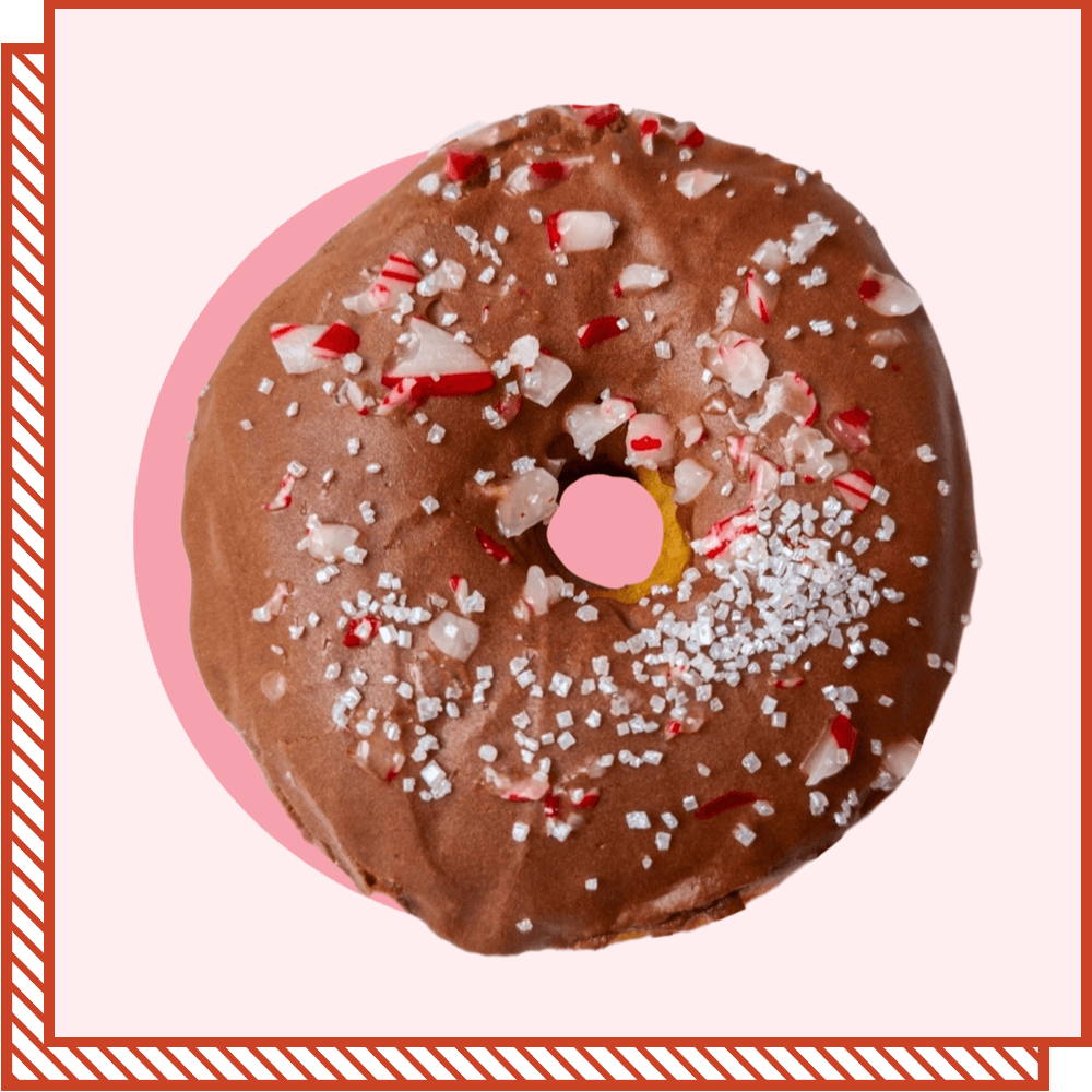 A ring donut dipped in a chocolate peppermint glaze and topped with crushed peppermint candy cane pieces and glittery sugar snow.