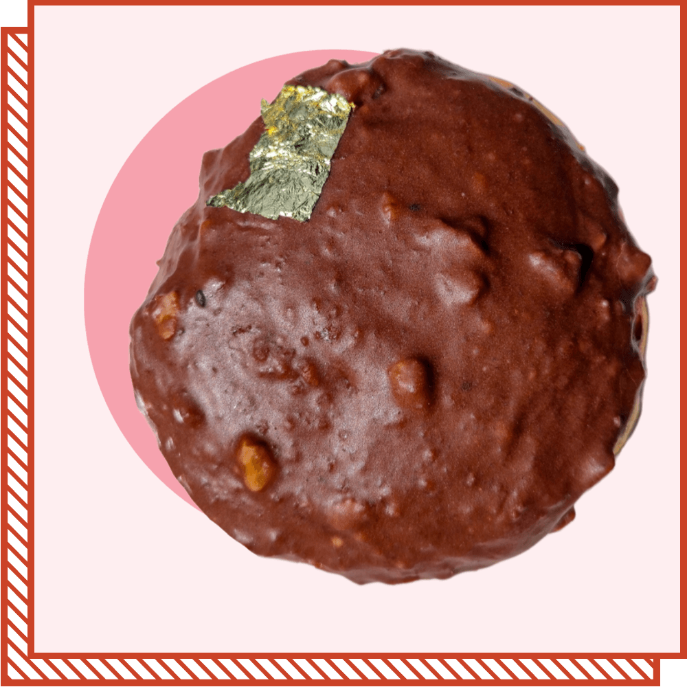 A donut filled with a super creamy chocolate hazelnut mousse and dipped in a crunchy dark chocolate glaze made with roasted hazelnut and wafer pieces.
