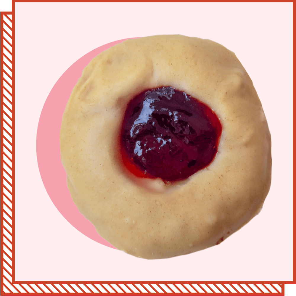A ring donut dipped in a fudgy and spiced ginger glaze and filled with a fruity plum jam.
