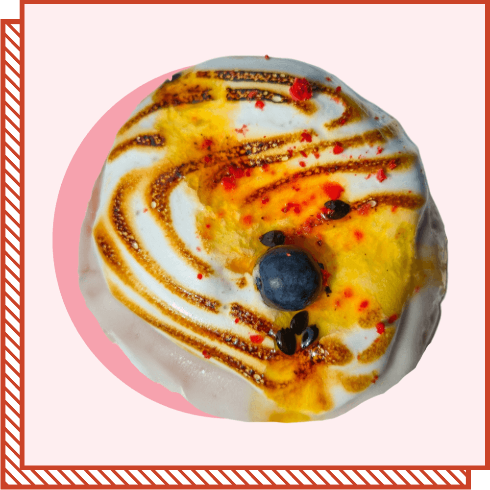A donut filled with a smooth strawberry buttercream, dipped in our signature vanilla icing, topped with flame-torched meringue and decorated with a drizzle of passionfruit sauce, freeze-dried strawberries and a blueberry.